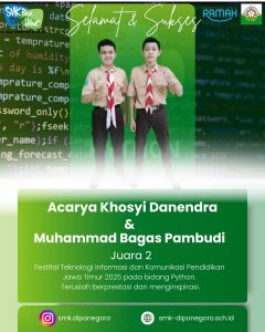 SMK Diponegoro Tulakan kembali menorehkan prestasi membanggakan di bidang teknologi informasi. Dua siswa terbaik kami, Acarya Khosyi Danendra dan Muhammad Bagas Pambudi, berhasil meraih Juara 2 pada Festival Teknologi Informasi dan Komunikasi Pendidikan Jawa Timur Tahun 2025.